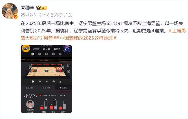 广东媒体人麦穗丰则认为:在2025年最后一场比赛中,辽宁男篮主场65比91爆冷不敌上海男篮,以一场失利告别2025年。据统计,辽宁男篮赛季至今爆冷5次,近期更是4连爆。